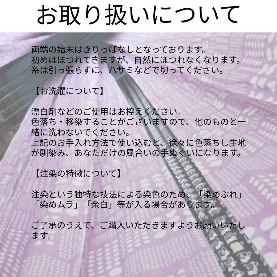 注染という独特な技法による染色のため、「染めぶれ」「染めムラ」「余白」等が入る場合があります。ご了承のうえで、ご購入いただきますようお願いいたします。