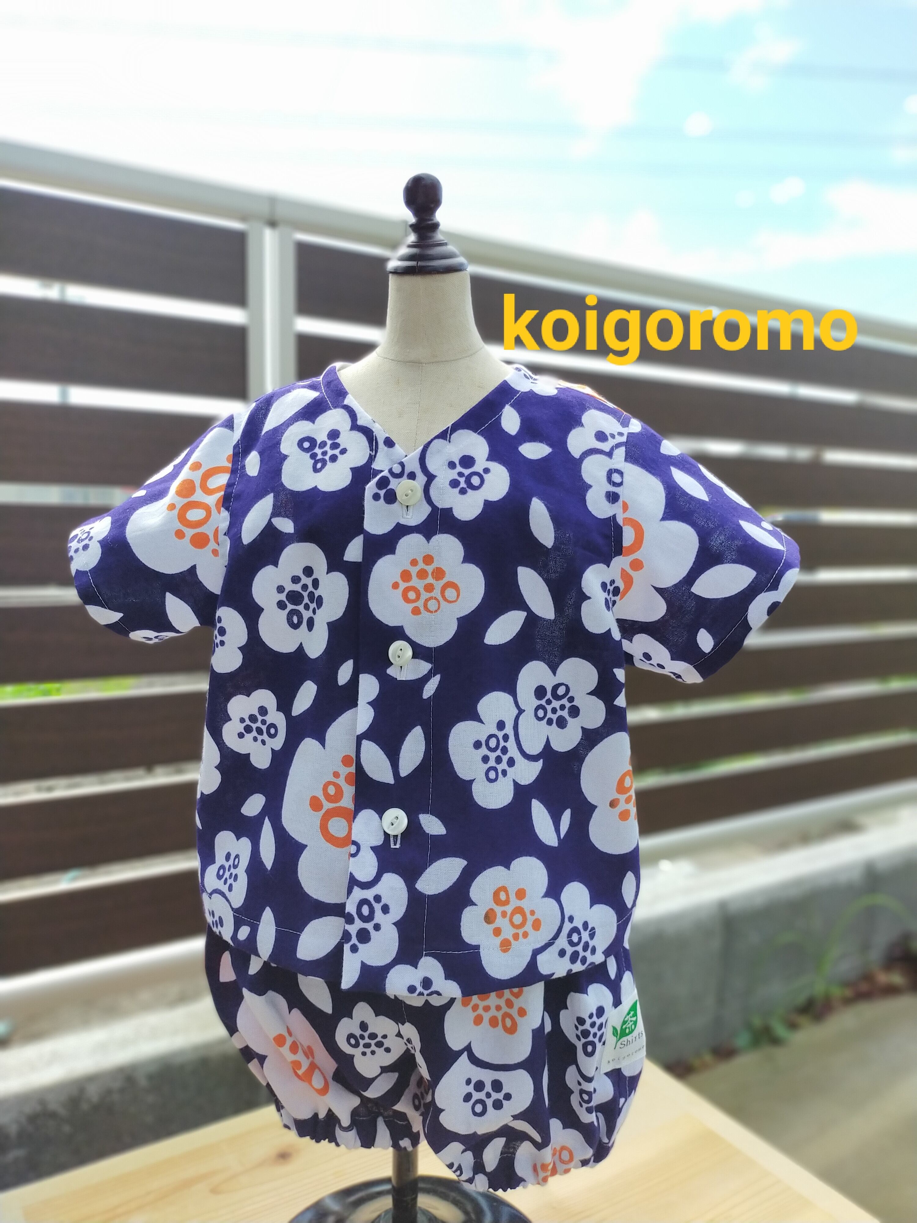 手ぬぐいシャツ&パンツ90サイズ【茶の花紫×オレンジ】