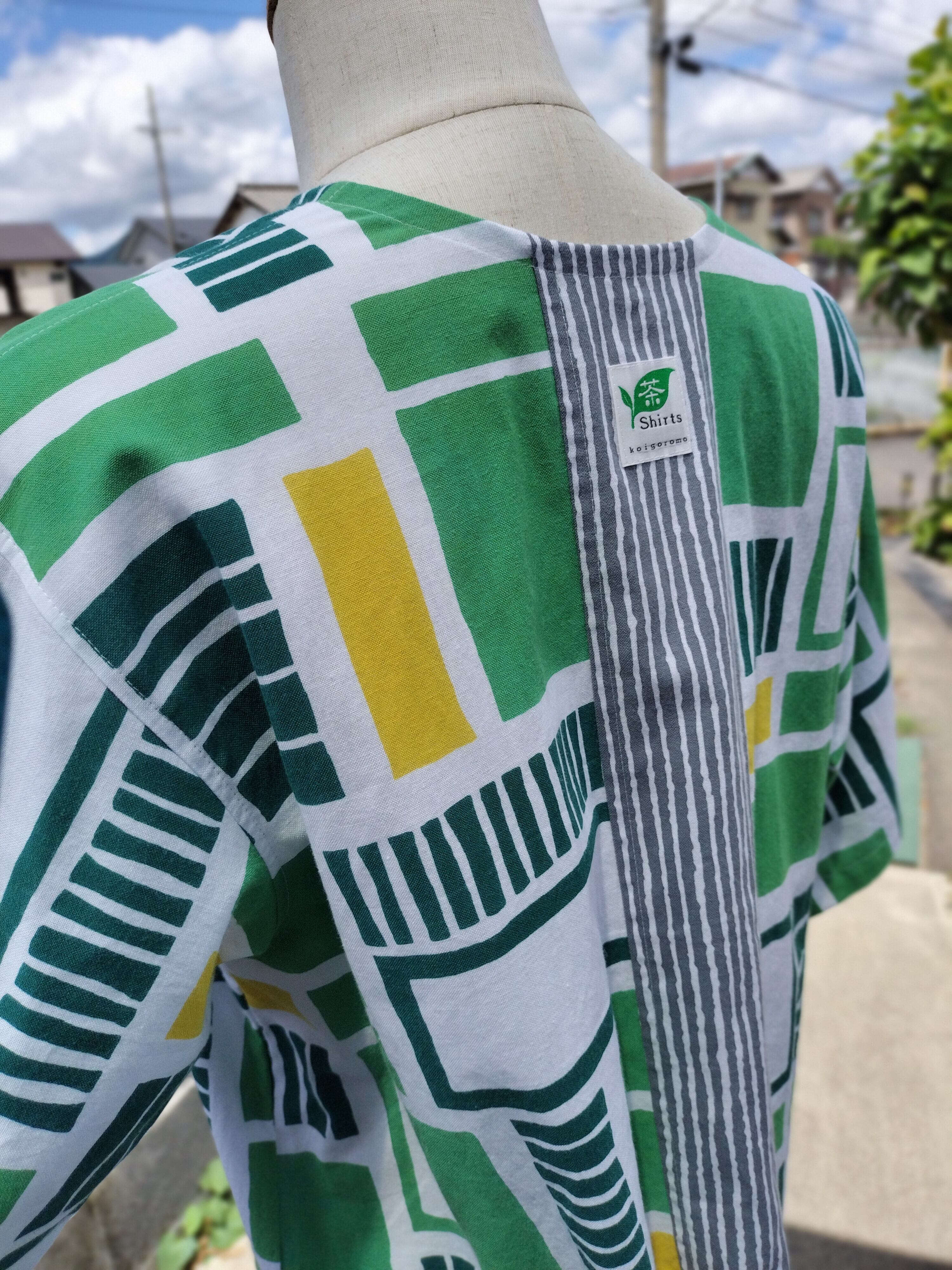 手ぬぐいシャツ【茶畑・緑✕縞グレー】メンズLサイズ茶Shirts