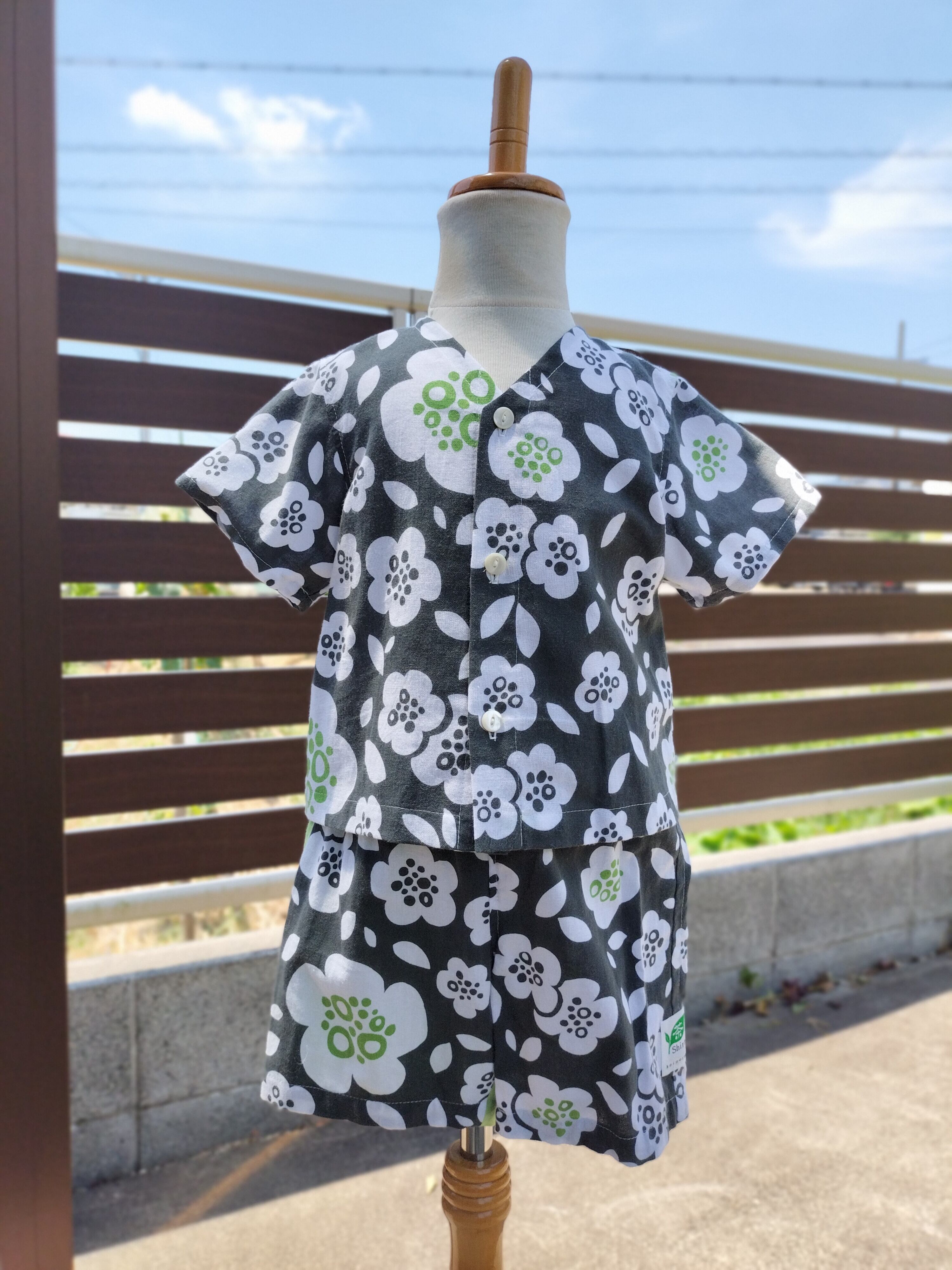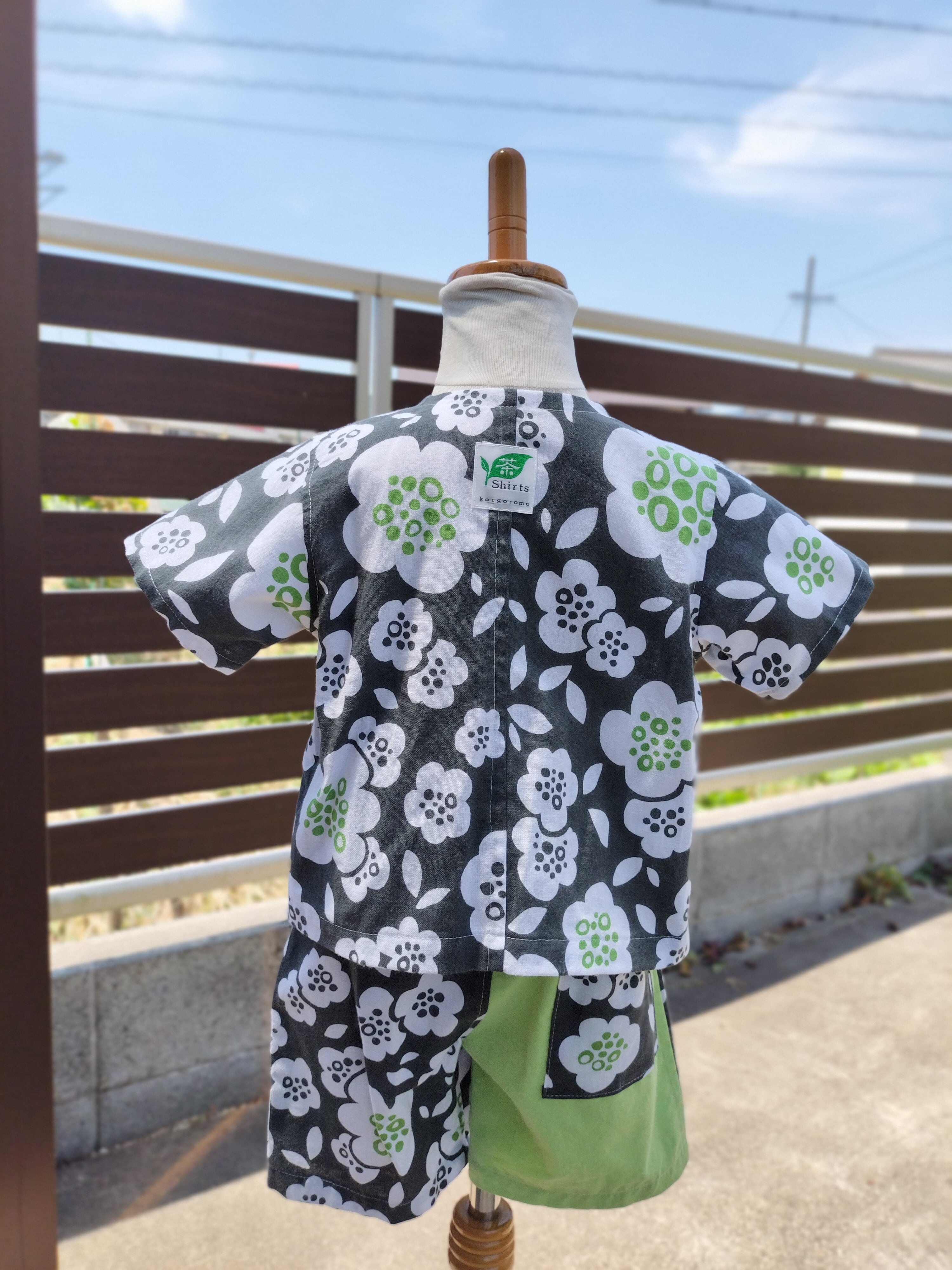 手ぬぐいシャツ&パンツ100サイズ【茶の花・灰✕みどり】