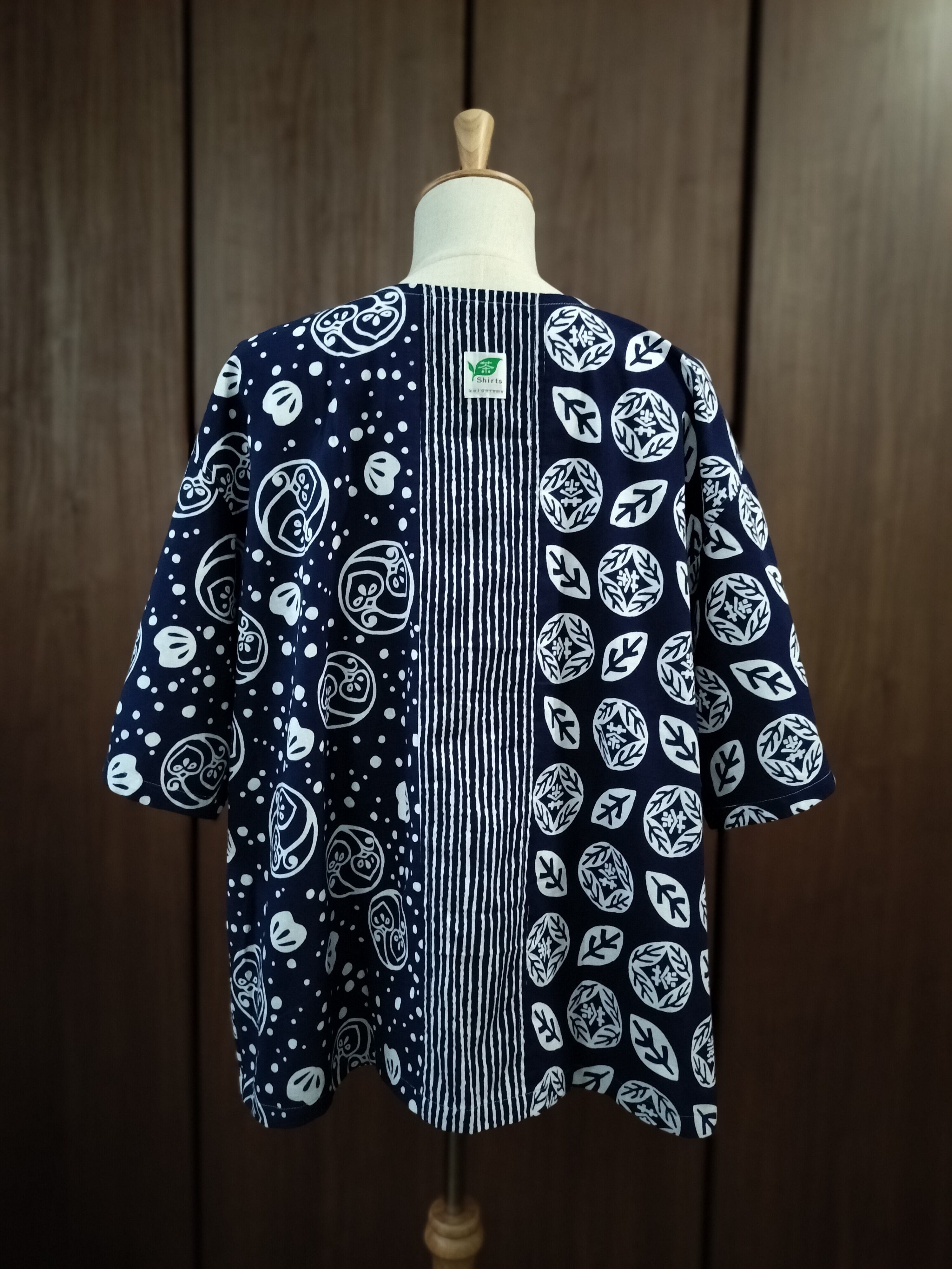 手ぬぐいシャツ【茶の実✕葉の茶✕縞・紺】メンズLLサイズ