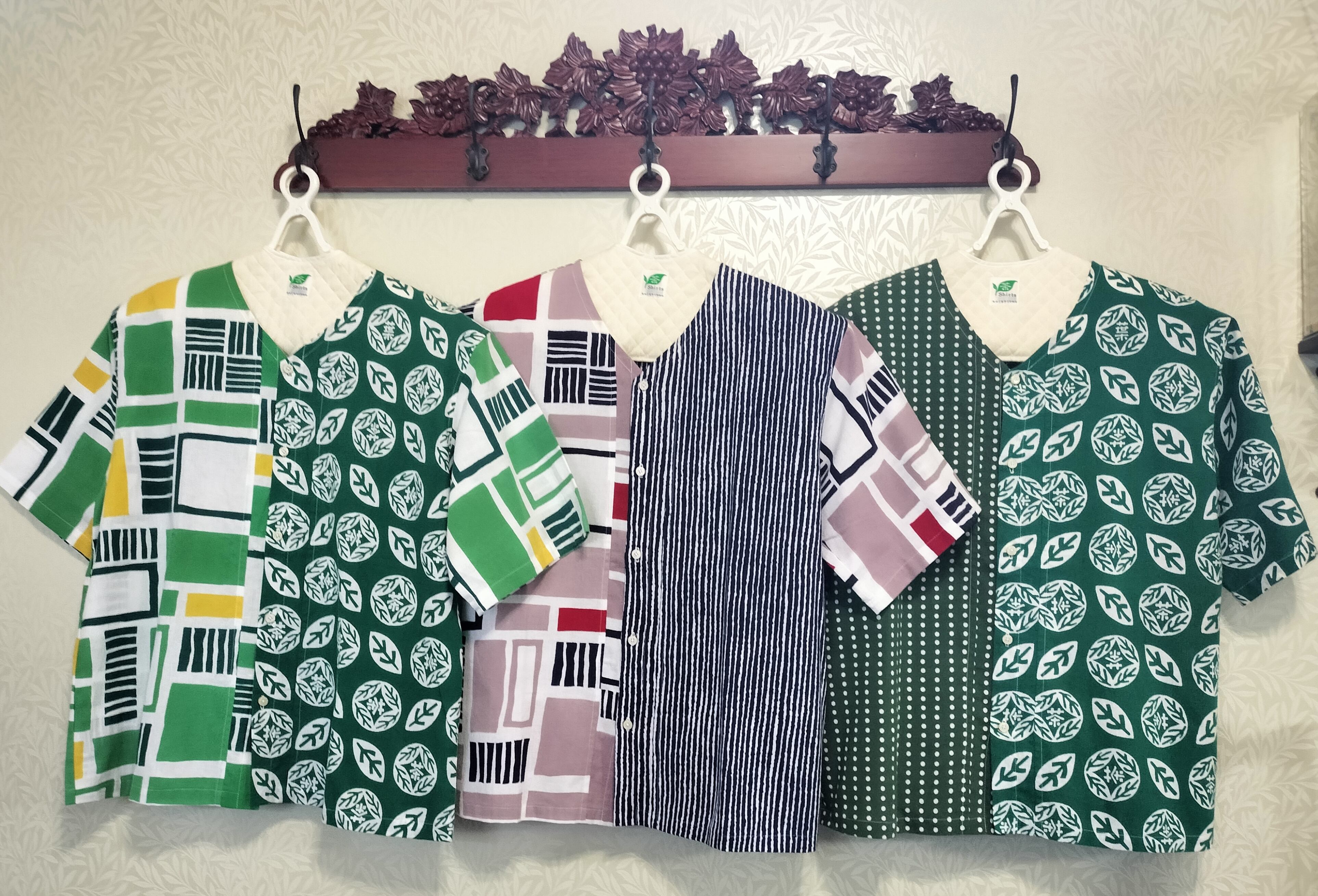 手ぬぐいシャツ【葉の茶・みどり✕豆絞り・みどり】メンズLサイズ